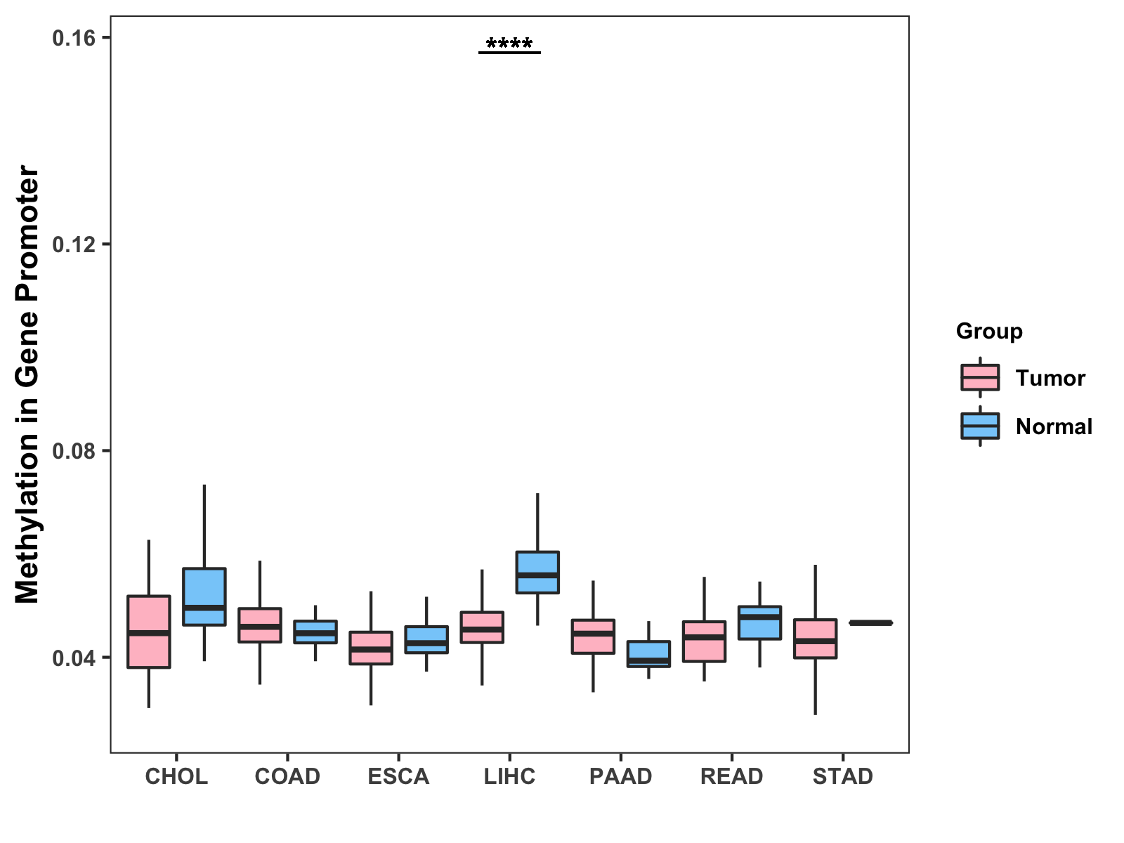Boxplot of All Gastrointestinal Cancer ( * : 0.01-0.05 , ** : 0.005-0.01 , *** : 0.0001-0.005 , **** : < 0.0001 ) |