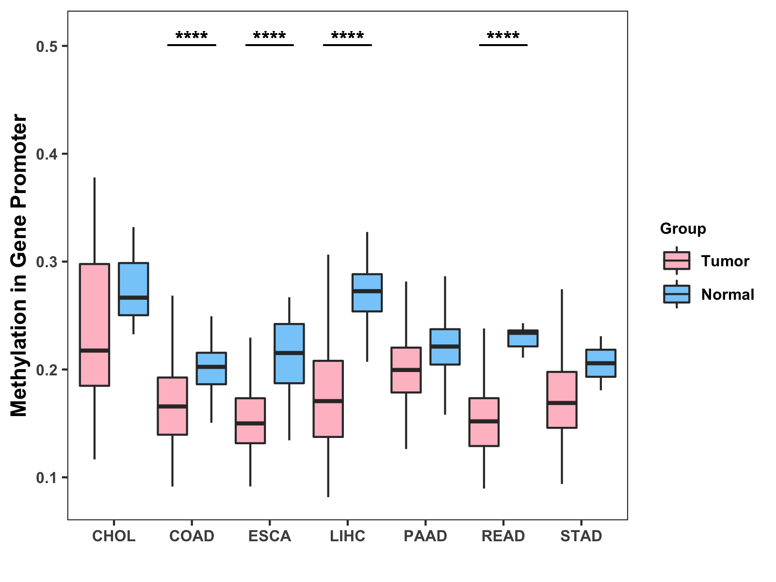 Boxplot of All Gastrointestinal Cancer ( * : 0.01-0.05 , ** : 0.005-0.01 , *** : 0.0001-0.005 , **** : < 0.0001 ) |