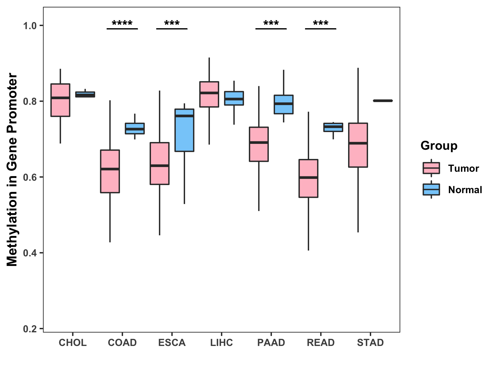 Boxplot of All Gastrointestinal Cancer ( * : 0.01-0.05 , ** : 0.005-0.01 , *** : 0.0001-0.005 , **** : < 0.0001 ) |