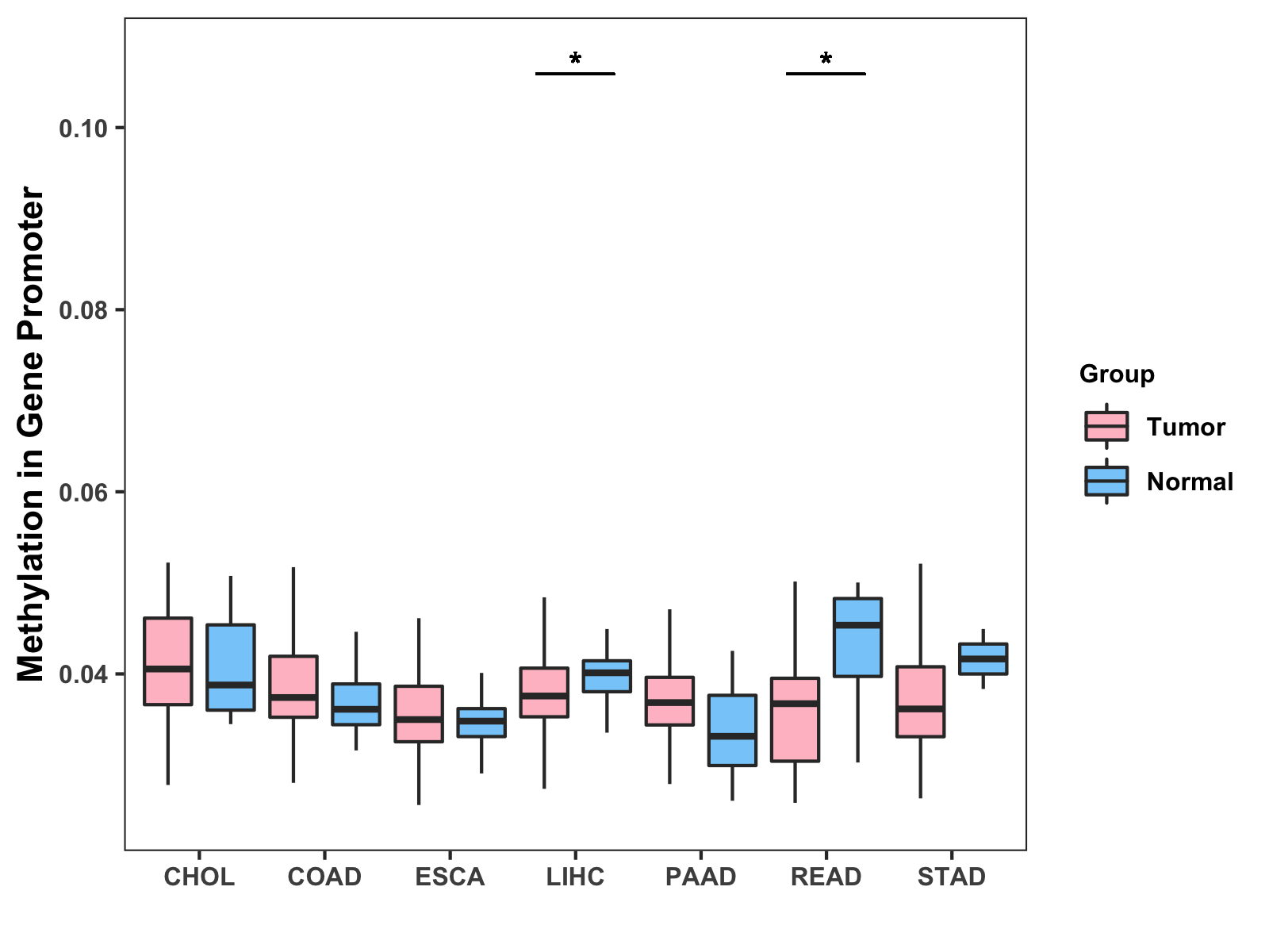 Boxplot of All Gastrointestinal Cancer ( * : 0.01-0.05 , ** : 0.005-0.01 , *** : 0.0001-0.005 , **** : < 0.0001 ) |