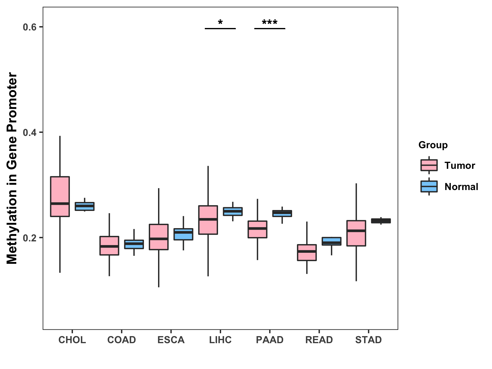 Boxplot of All Gastrointestinal Cancer ( * : 0.01-0.05 , ** : 0.005-0.01 , *** : 0.0001-0.005 , **** : < 0.0001 ) |