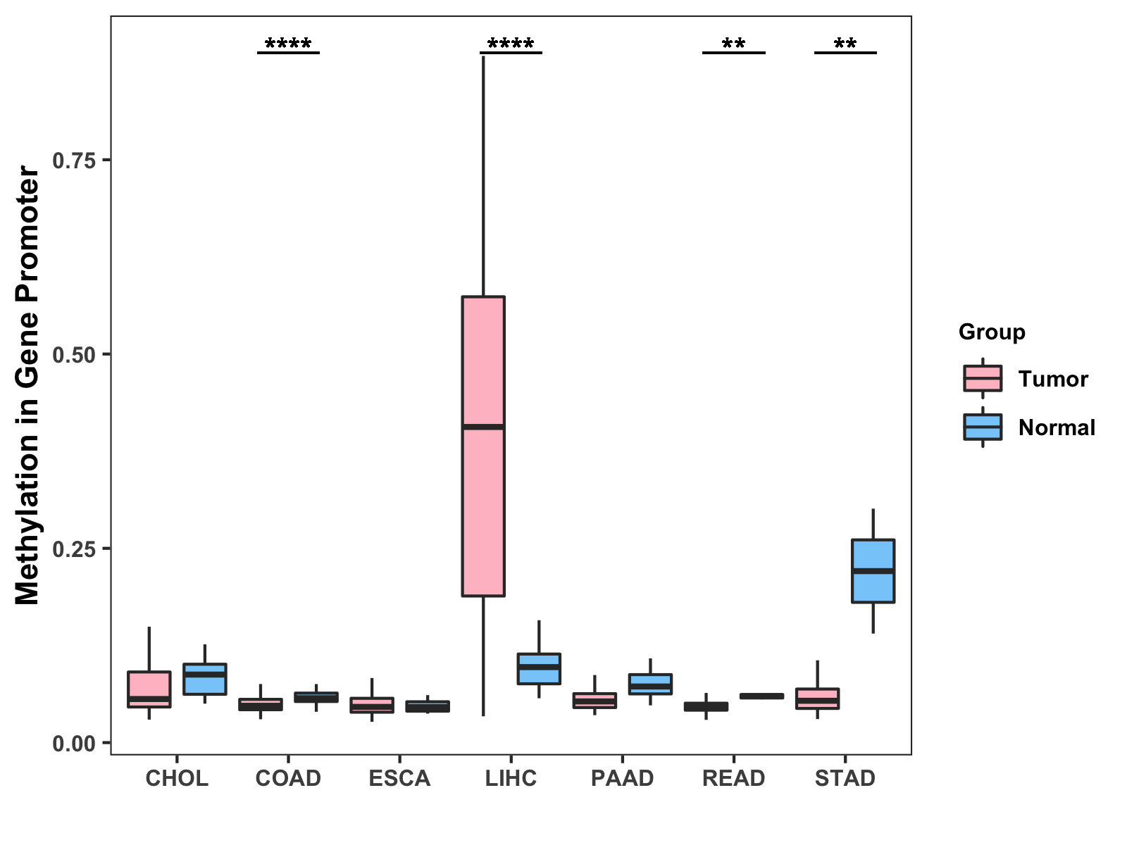 Boxplot of All Gastrointestinal Cancer ( * : 0.01-0.05 , ** : 0.005-0.01 , *** : 0.0001-0.005 , **** : < 0.0001 ) |