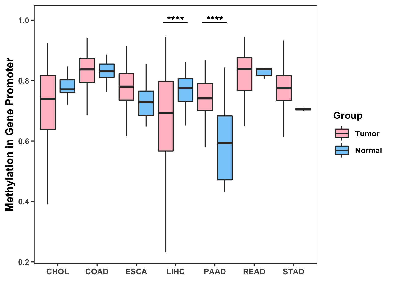 Boxplot of All Gastrointestinal Cancer ( * : 0.01-0.05 , ** : 0.005-0.01 , *** : 0.0001-0.005 , **** : < 0.0001 ) |