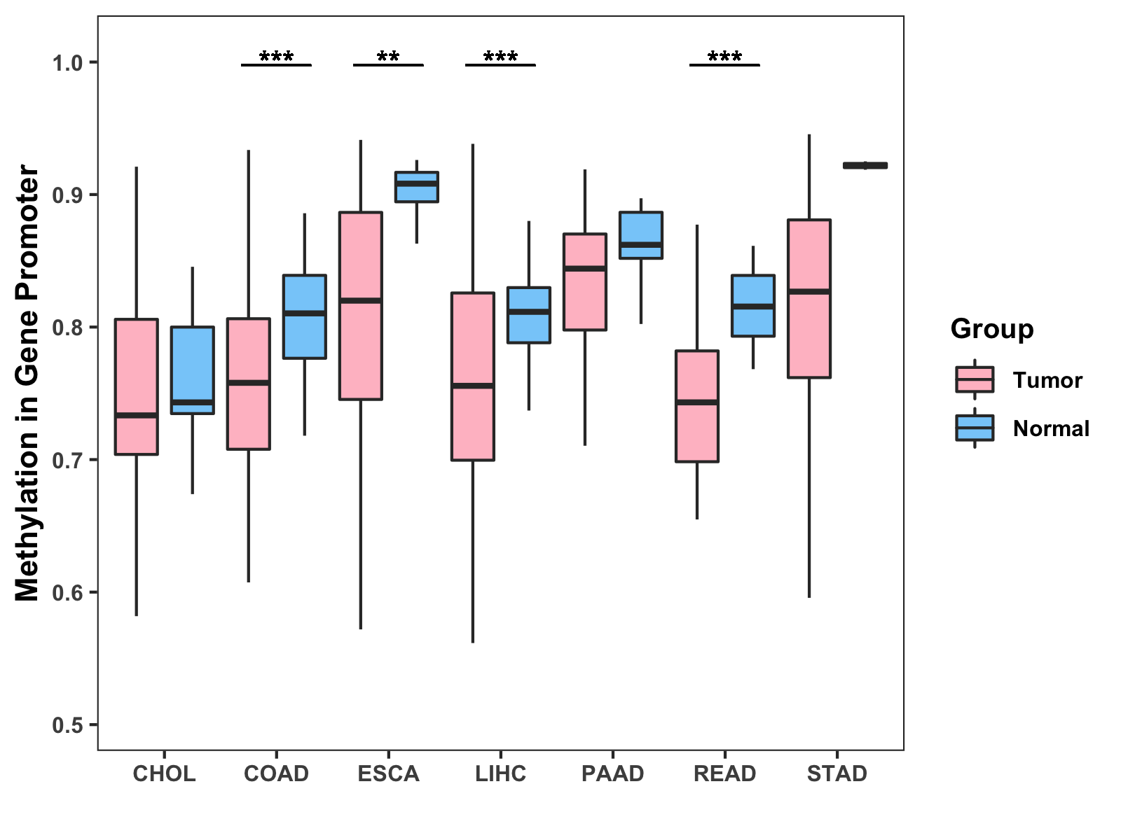 Boxplot of All Gastrointestinal Cancer ( * : 0.01-0.05 , ** : 0.005-0.01 , *** : 0.0001-0.005 , **** : < 0.0001 ) |