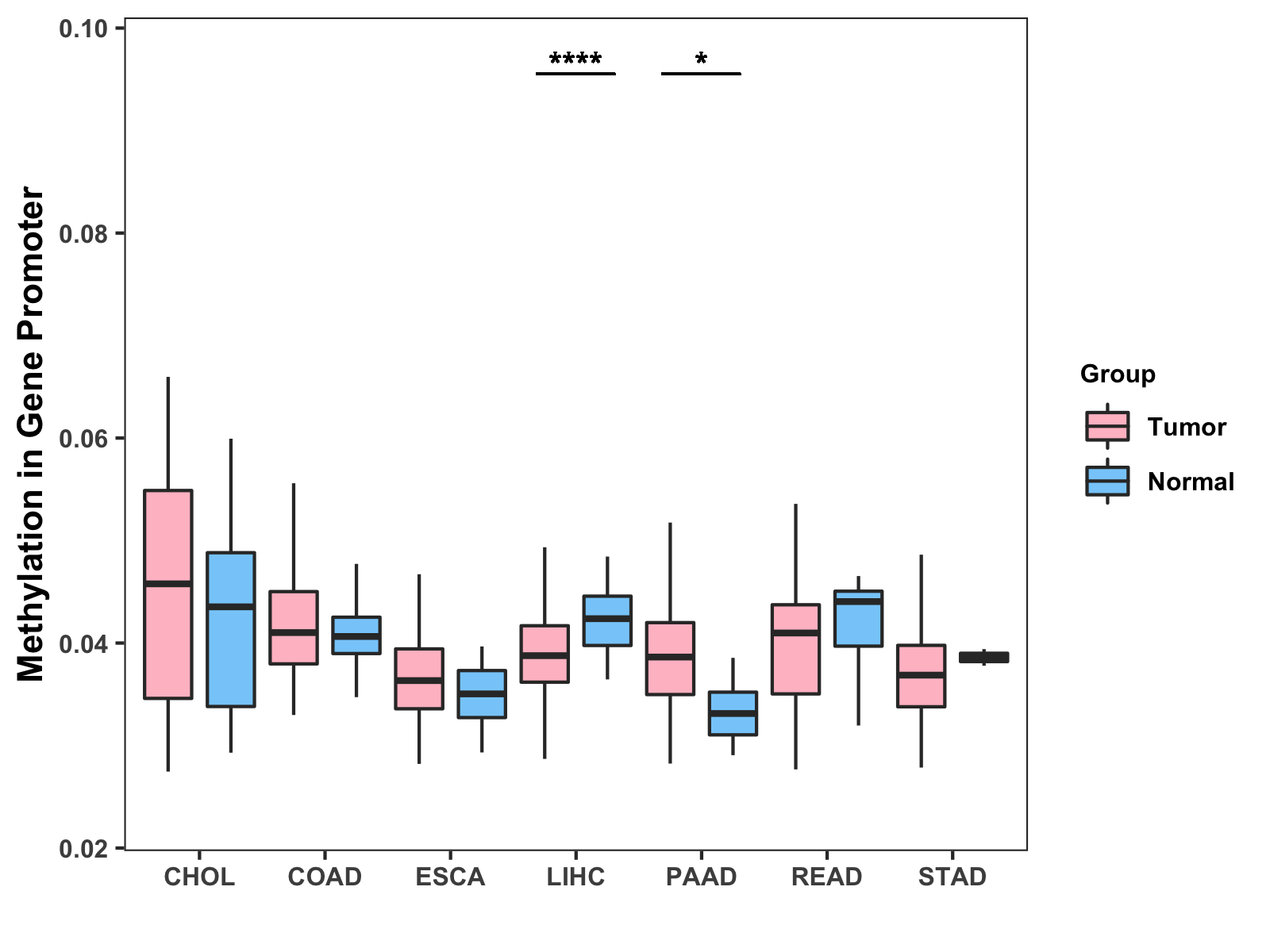 Boxplot of All Gastrointestinal Cancer ( * : 0.01-0.05 , ** : 0.005-0.01 , *** : 0.0001-0.005 , **** : < 0.0001 ) |