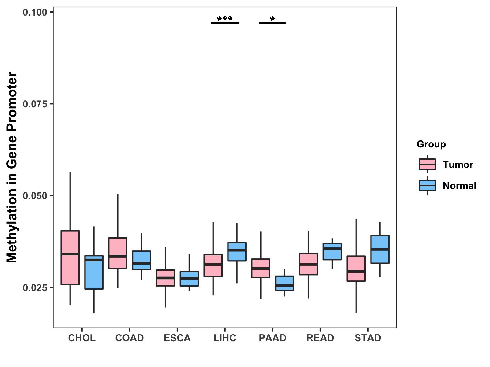 Boxplot of All Gastrointestinal Cancer ( * : 0.01-0.05 , ** : 0.005-0.01 , *** : 0.0001-0.005 , **** : < 0.0001 ) |