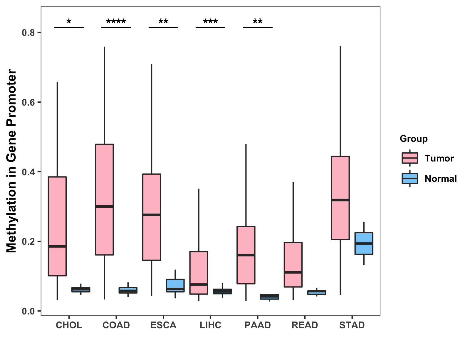 Boxplot of All Gastrointestinal Cancer ( * : 0.01-0.05 , ** : 0.005-0.01 , *** : 0.0001-0.005 , **** : < 0.0001 ) |