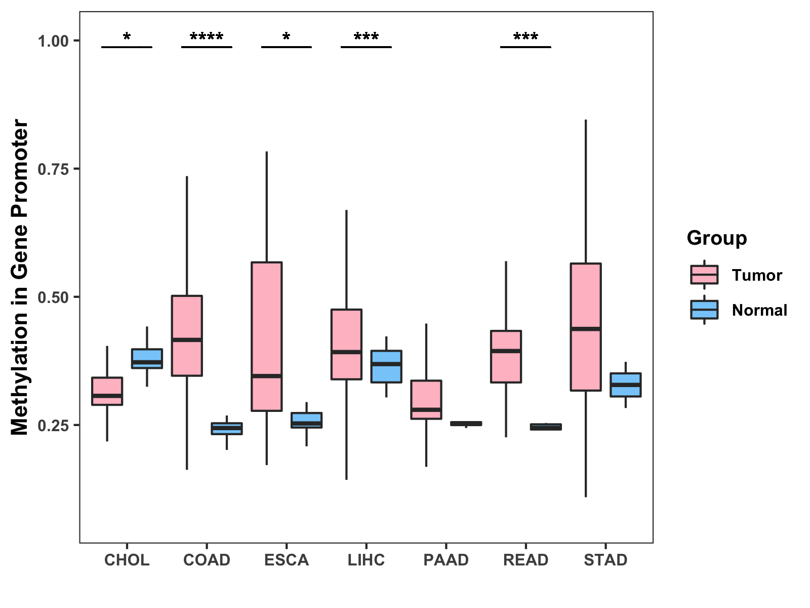 Boxplot of All Gastrointestinal Cancer ( * : 0.01-0.05 , ** : 0.005-0.01 , *** : 0.0001-0.005 , **** : < 0.0001 ) |