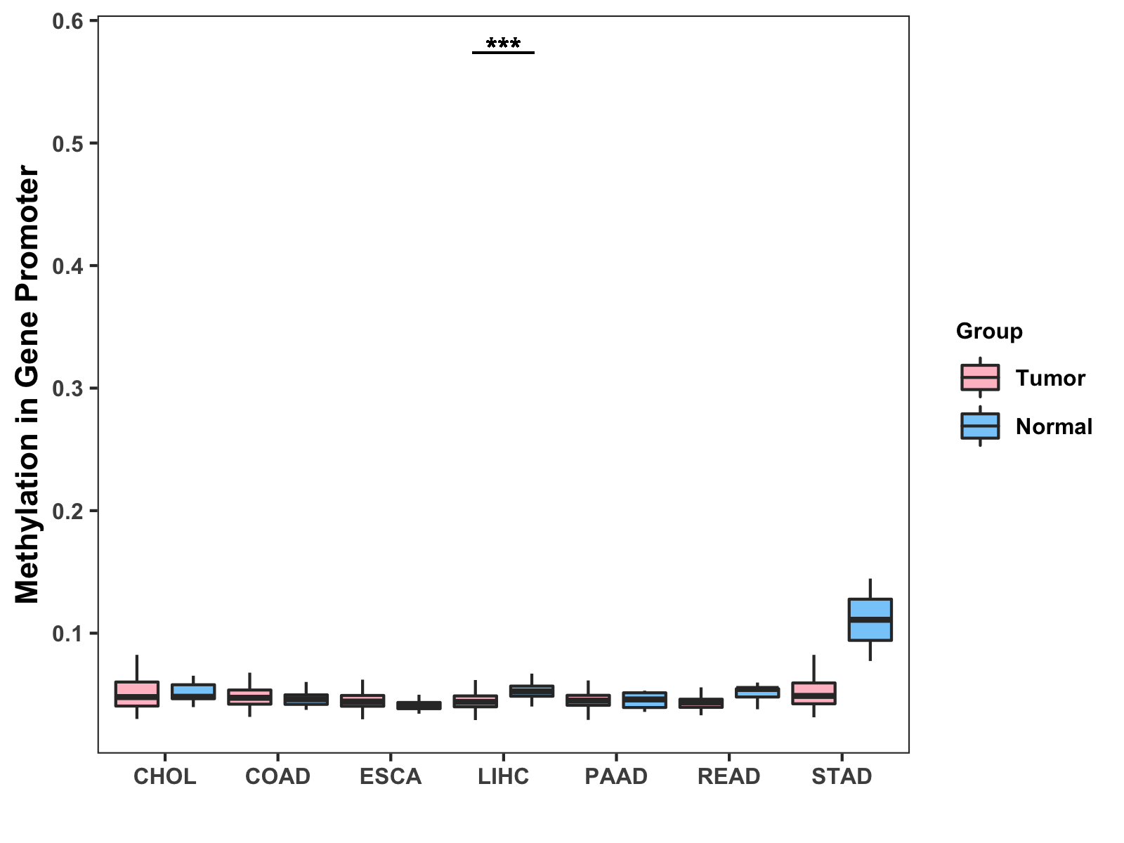 Boxplot of All Gastrointestinal Cancer ( * : 0.01-0.05 , ** : 0.005-0.01 , *** : 0.0001-0.005 , **** : < 0.0001 ) |
