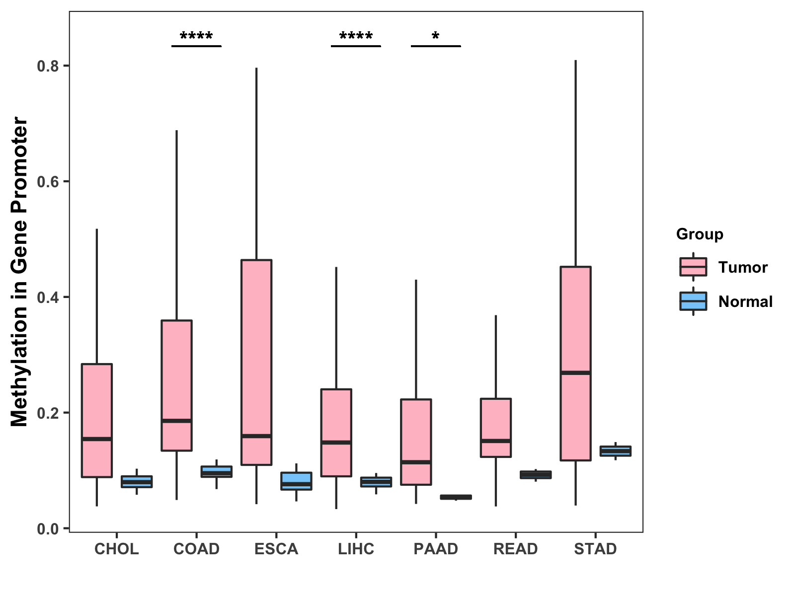 Boxplot of All Gastrointestinal Cancer ( * : 0.01-0.05 , ** : 0.005-0.01 , *** : 0.0001-0.005 , **** : < 0.0001 ) |
