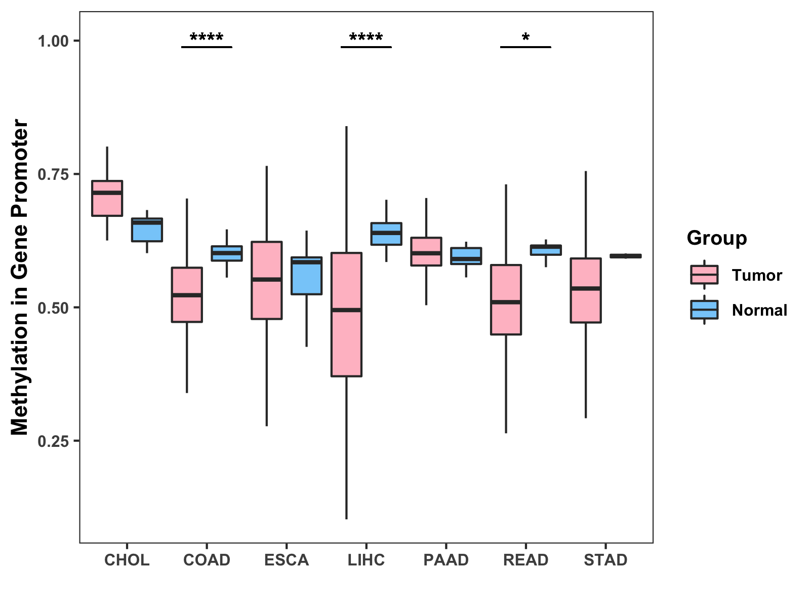 Boxplot of All Gastrointestinal Cancer ( * : 0.01-0.05 , ** : 0.005-0.01 , *** : 0.0001-0.005 , **** : < 0.0001 ) |