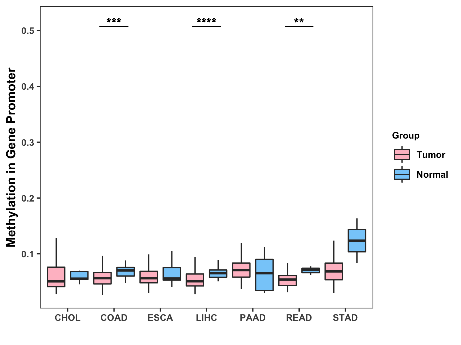 Boxplot of All Gastrointestinal Cancer ( * : 0.01-0.05 , ** : 0.005-0.01 , *** : 0.0001-0.005 , **** : < 0.0001 ) |