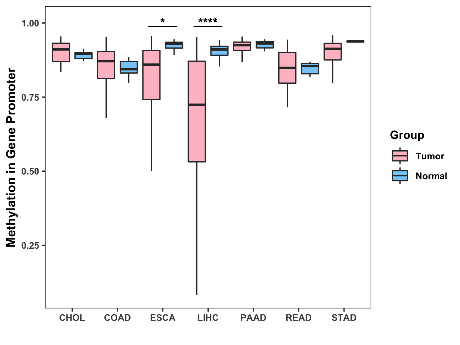 Boxplot of All Gastrointestinal Cancer ( * : 0.01-0.05 , ** : 0.005-0.01 , *** : 0.0001-0.005 , **** : < 0.0001 ) |