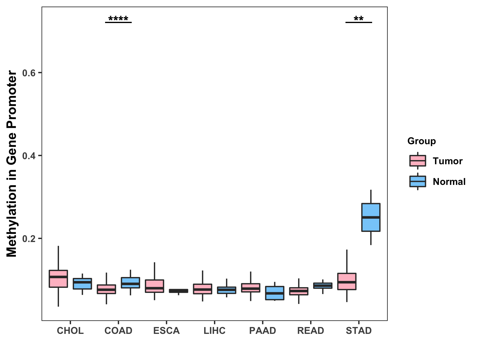 Boxplot of All Gastrointestinal Cancer ( * : 0.01-0.05 , ** : 0.005-0.01 , *** : 0.0001-0.005 , **** : < 0.0001 ) |