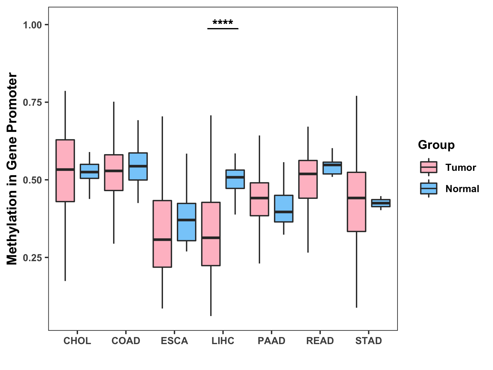 Boxplot of All Gastrointestinal Cancer ( * : 0.01-0.05 , ** : 0.005-0.01 , *** : 0.0001-0.005 , **** : < 0.0001 ) |