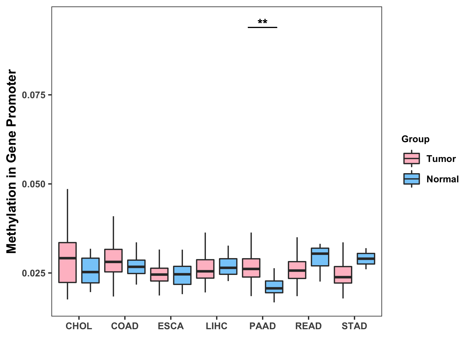 Boxplot of All Gastrointestinal Cancer ( * : 0.01-0.05 , ** : 0.005-0.01 , *** : 0.0001-0.005 , **** : < 0.0001 ) |
