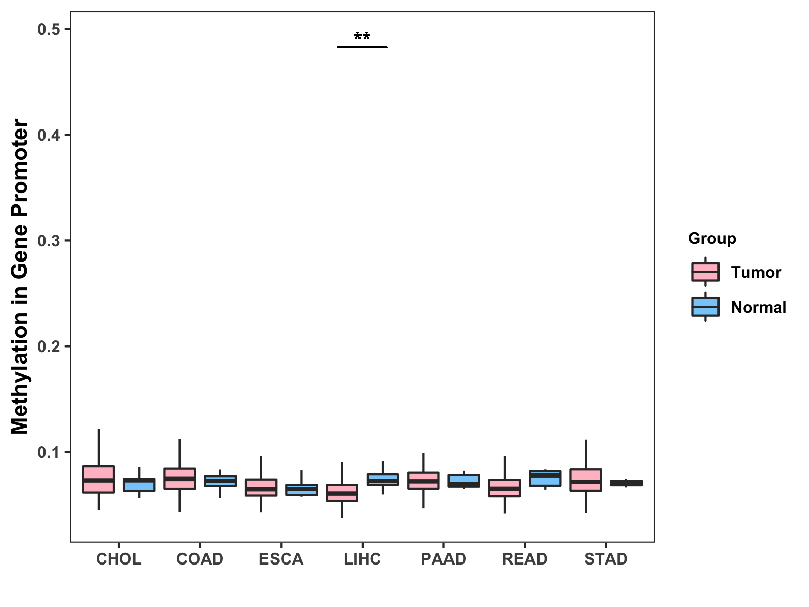 Boxplot of All Gastrointestinal Cancer ( * : 0.01-0.05 , ** : 0.005-0.01 , *** : 0.0001-0.005 , **** : < 0.0001 ) |