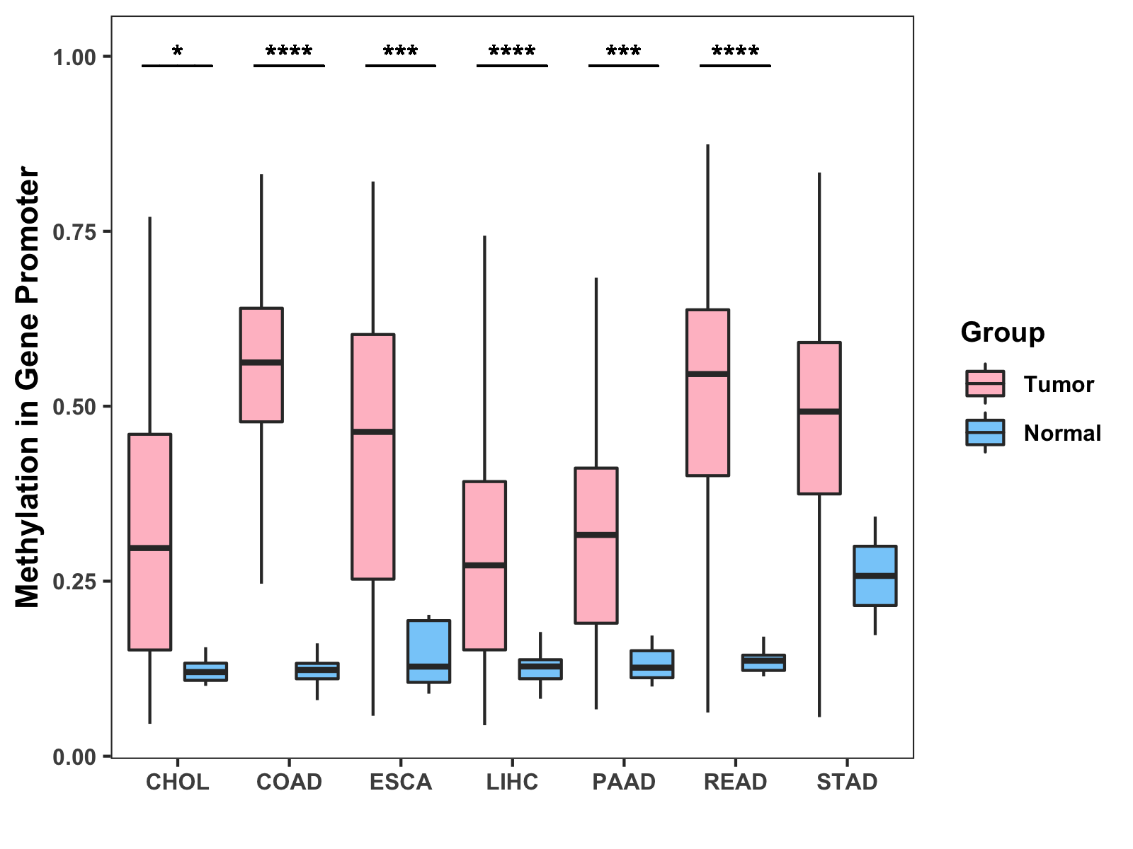 Boxplot of All Gastrointestinal Cancer ( * : 0.01-0.05 , ** : 0.005-0.01 , *** : 0.0001-0.005 , **** : < 0.0001 ) |