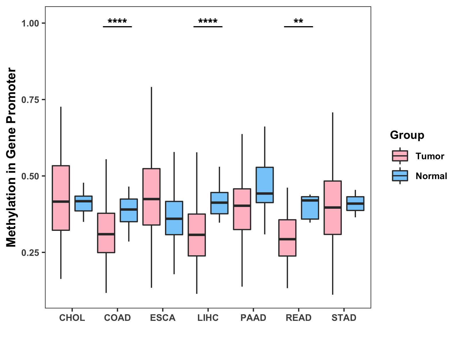 Boxplot of All Gastrointestinal Cancer ( * : 0.01-0.05 , ** : 0.005-0.01 , *** : 0.0001-0.005 , **** : < 0.0001 ) |