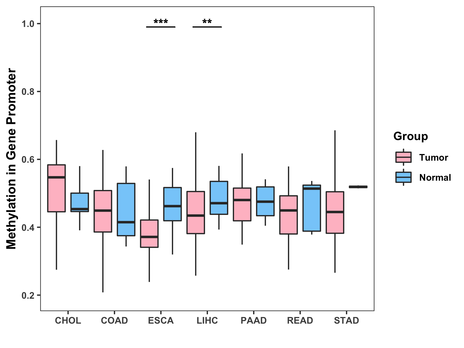 Boxplot of All Gastrointestinal Cancer ( * : 0.01-0.05 , ** : 0.005-0.01 , *** : 0.0001-0.005 , **** : < 0.0001 ) |