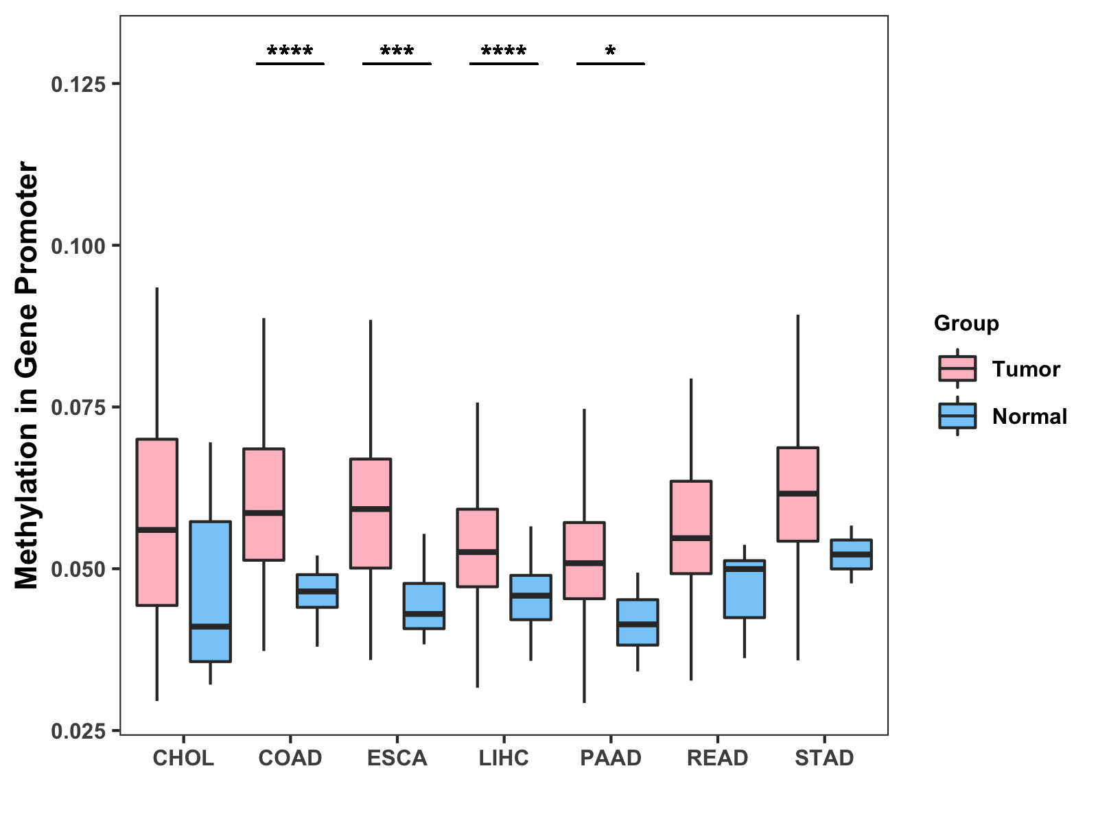 Boxplot of All Gastrointestinal Cancer ( * : 0.01-0.05 , ** : 0.005-0.01 , *** : 0.0001-0.005 , **** : < 0.0001 ) |