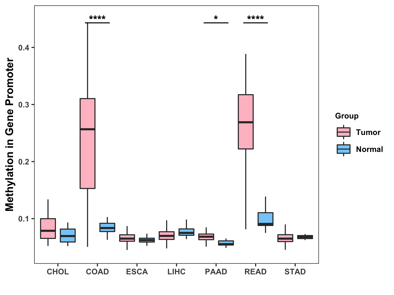 Boxplot of All Gastrointestinal Cancer ( * : 0.01-0.05 , ** : 0.005-0.01 , *** : 0.0001-0.005 , **** : < 0.0001 ) |