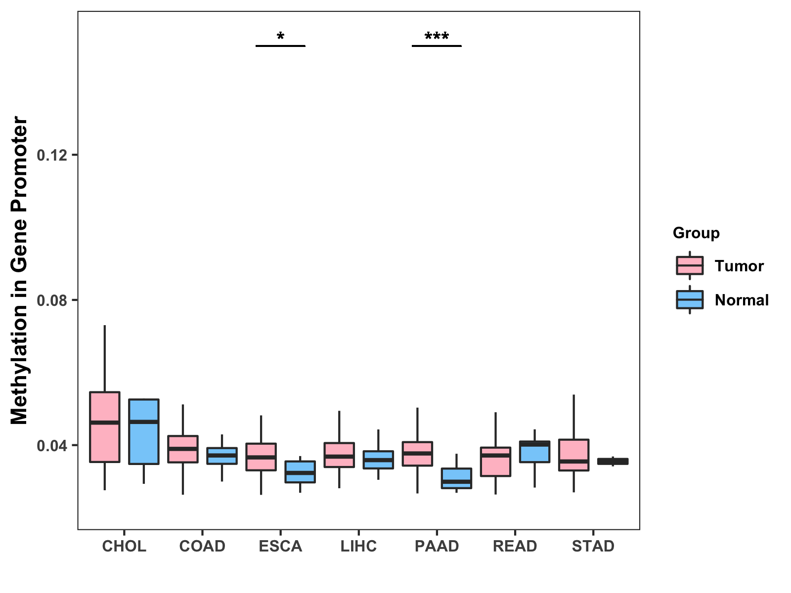 Boxplot of All Gastrointestinal Cancer ( * : 0.01-0.05 , ** : 0.005-0.01 , *** : 0.0001-0.005 , **** : < 0.0001 ) |