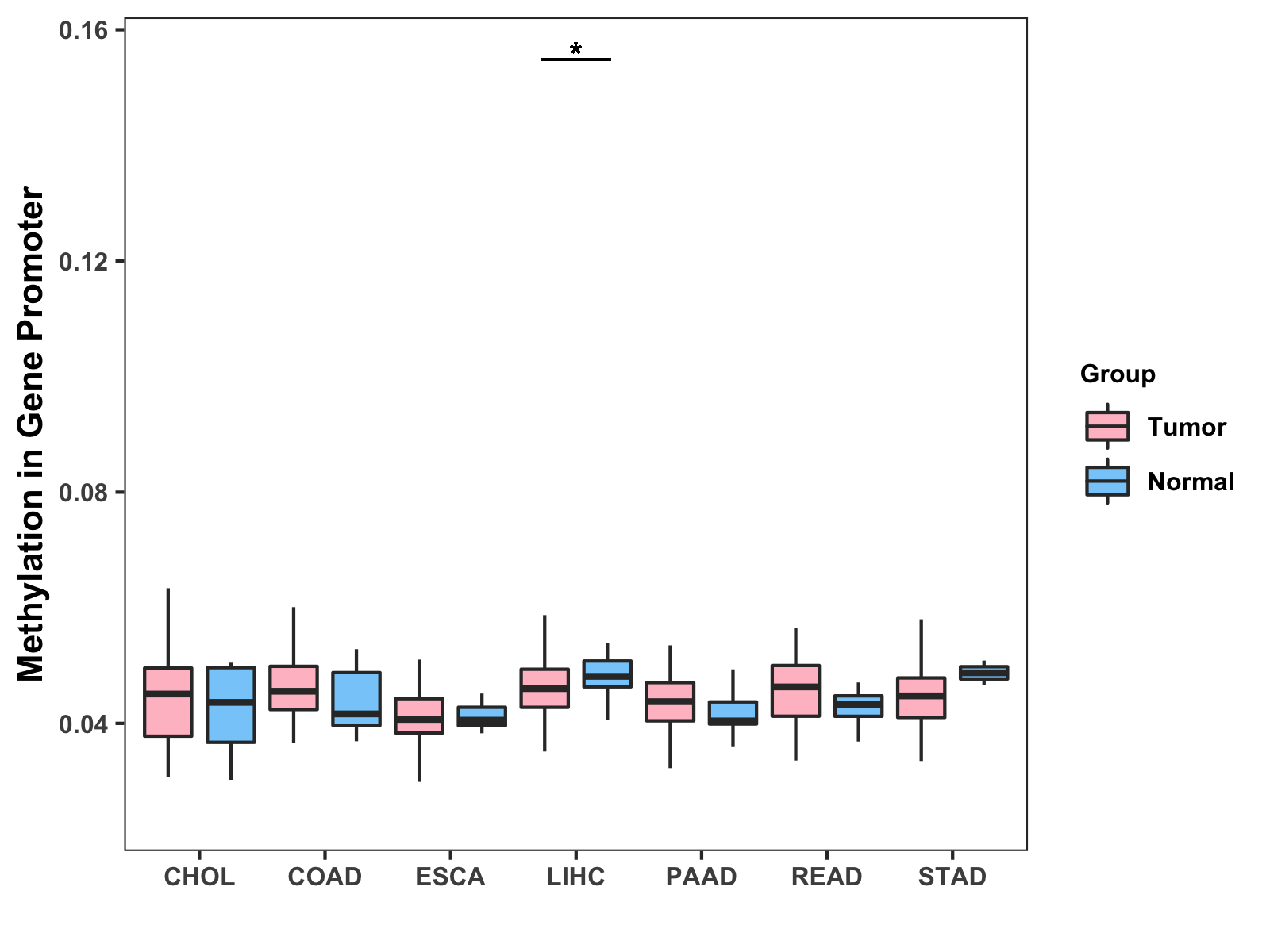 Boxplot of All Gastrointestinal Cancer ( * : 0.01-0.05 , ** : 0.005-0.01 , *** : 0.0001-0.005 , **** : < 0.0001 ) |