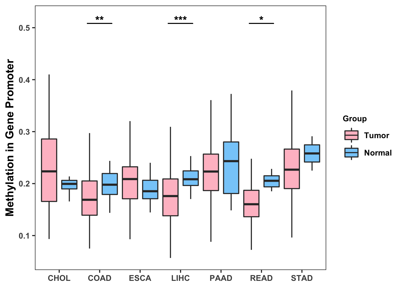 Boxplot of All Gastrointestinal Cancer ( * : 0.01-0.05 , ** : 0.005-0.01 , *** : 0.0001-0.005 , **** : < 0.0001 ) |