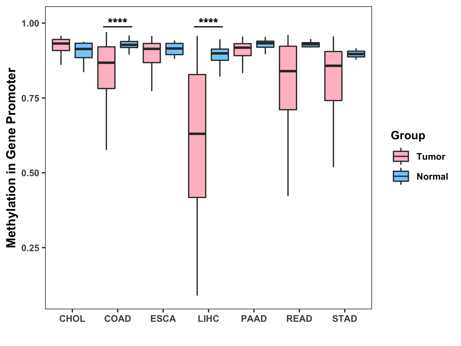 Boxplot of All Gastrointestinal Cancer ( * : 0.01-0.05 , ** : 0.005-0.01 , *** : 0.0001-0.005 , **** : < 0.0001 ) |