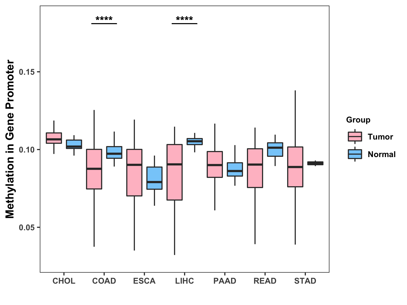 Boxplot of All Gastrointestinal Cancer ( * : 0.01-0.05 , ** : 0.005-0.01 , *** : 0.0001-0.005 , **** : < 0.0001 ) |