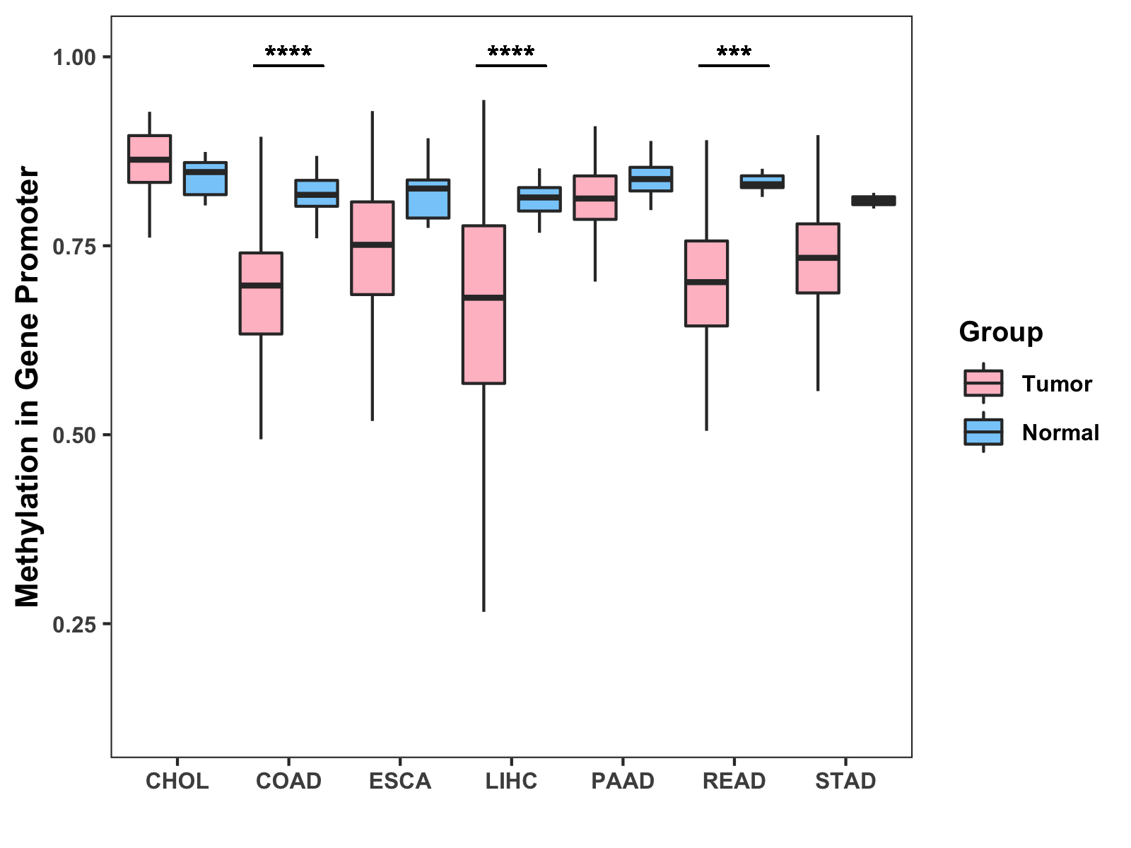 Boxplot of All Gastrointestinal Cancer ( * : 0.01-0.05 , ** : 0.005-0.01 , *** : 0.0001-0.005 , **** : < 0.0001 ) |