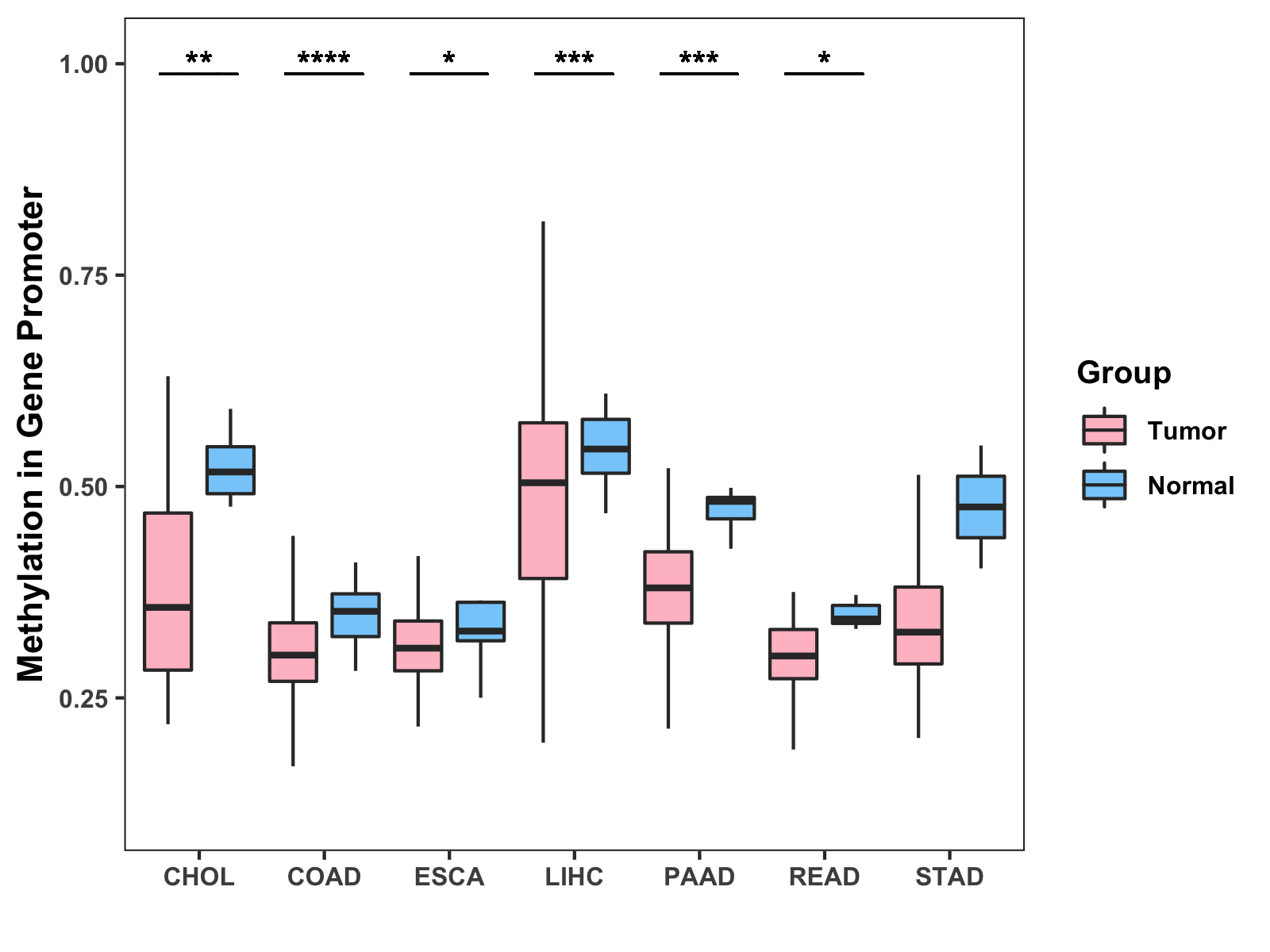 Boxplot of All Gastrointestinal Cancer ( * : 0.01-0.05 , ** : 0.005-0.01 , *** : 0.0001-0.005 , **** : < 0.0001 ) |