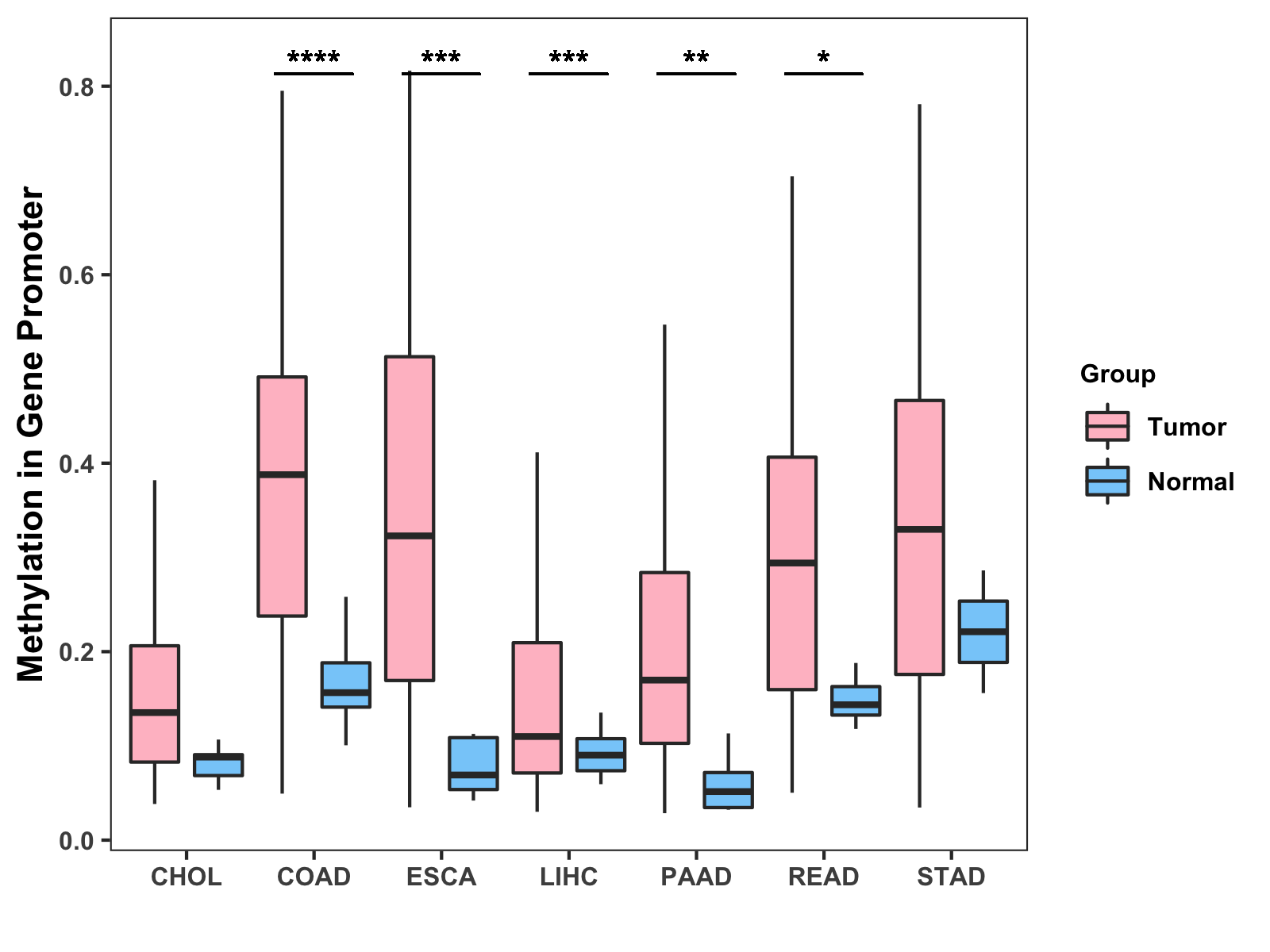 Boxplot of All Gastrointestinal Cancer ( * : 0.01-0.05 , ** : 0.005-0.01 , *** : 0.0001-0.005 , **** : < 0.0001 ) |