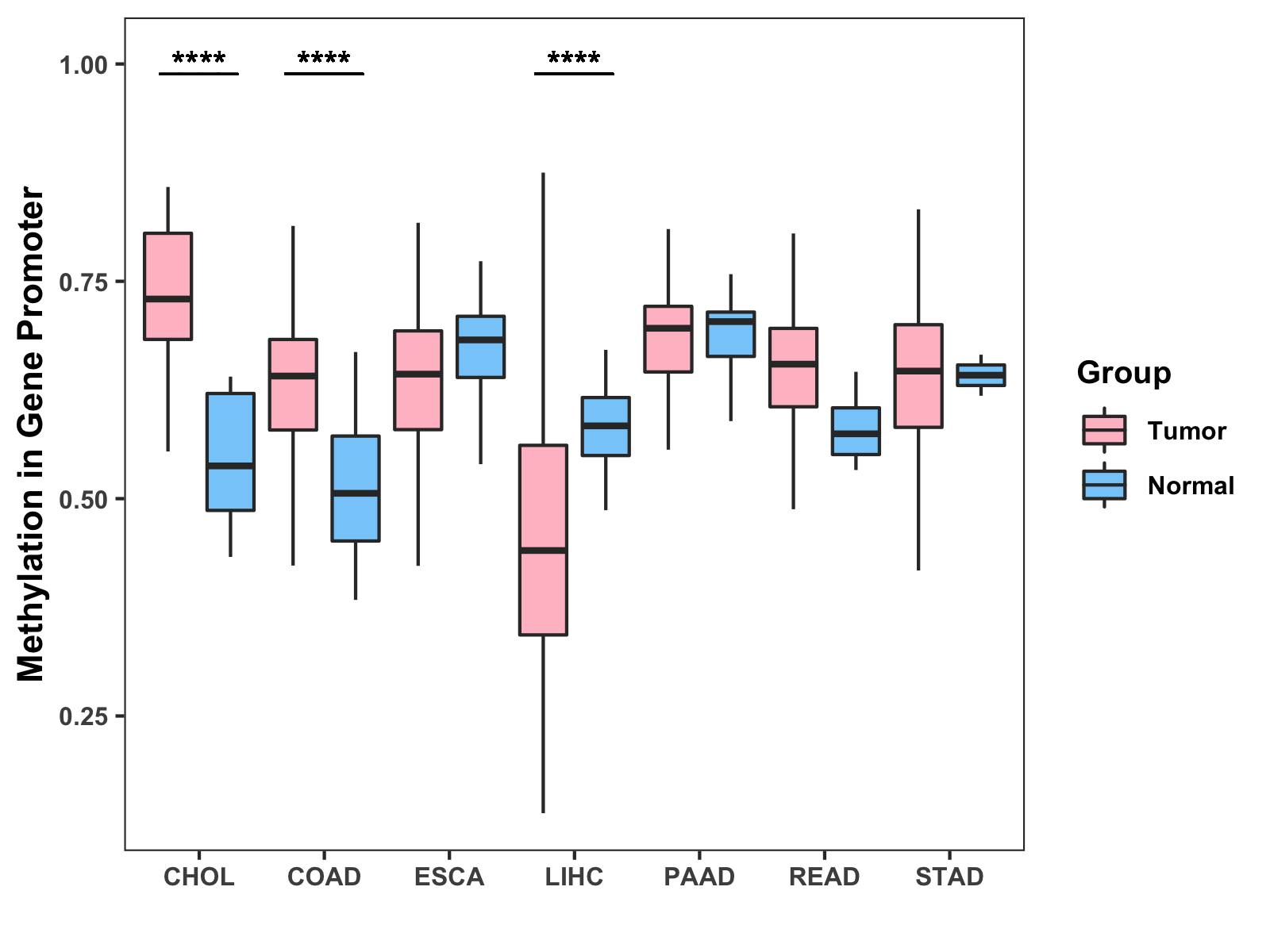 Boxplot of All Gastrointestinal Cancer ( * : 0.01-0.05 , ** : 0.005-0.01 , *** : 0.0001-0.005 , **** : < 0.0001 ) |
