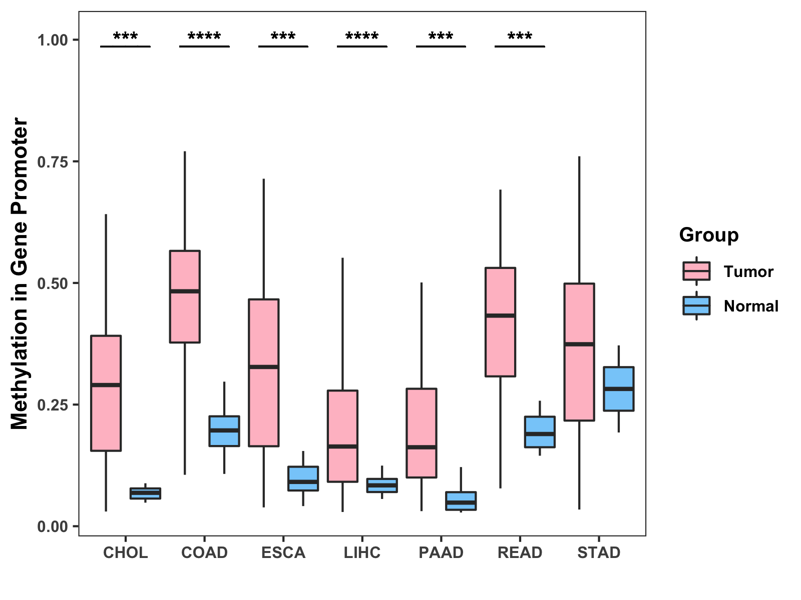 Boxplot of All Gastrointestinal Cancer ( * : 0.01-0.05 , ** : 0.005-0.01 , *** : 0.0001-0.005 , **** : < 0.0001 ) |
