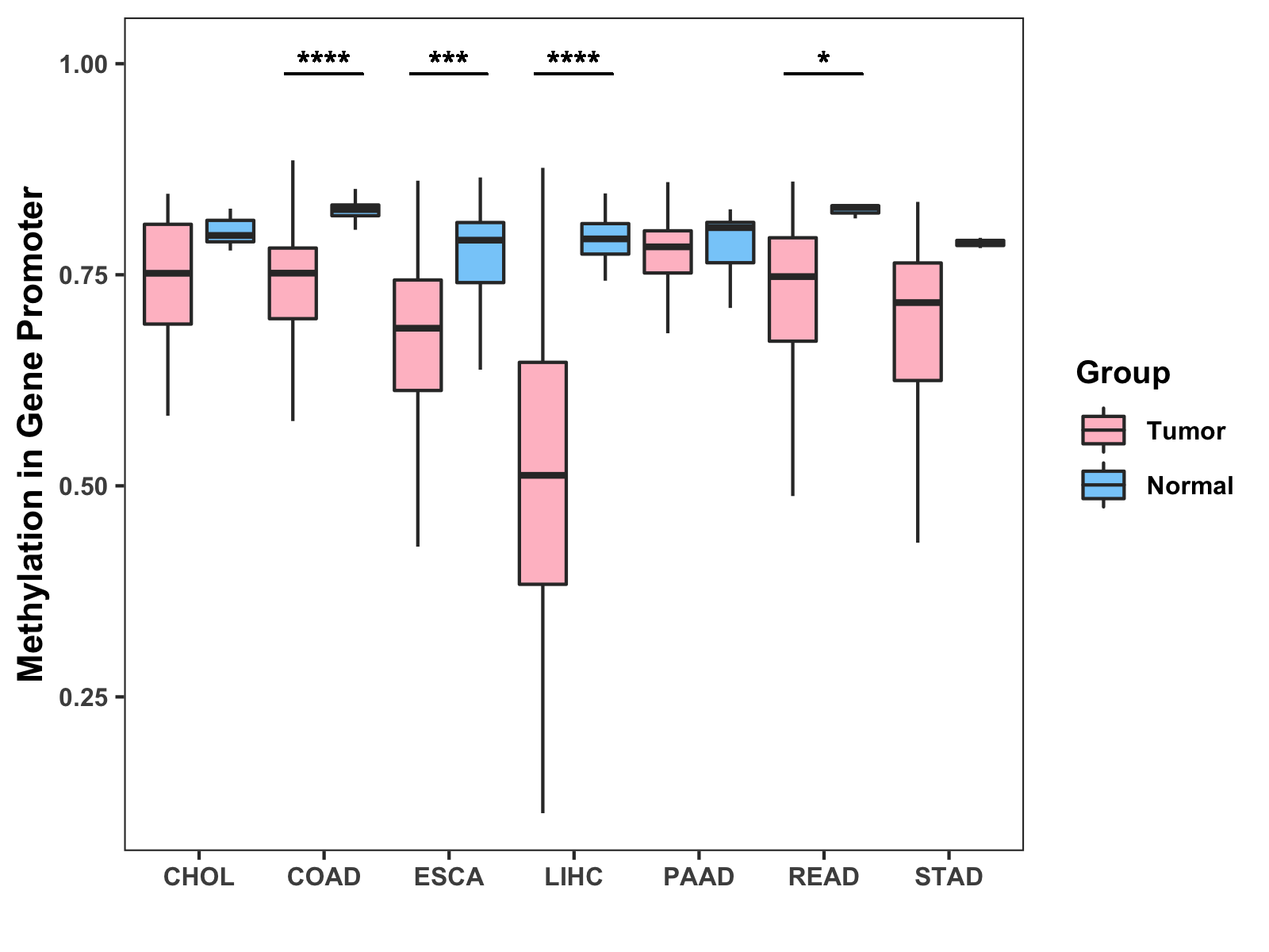 Boxplot of All Gastrointestinal Cancer ( * : 0.01-0.05 , ** : 0.005-0.01 , *** : 0.0001-0.005 , **** : < 0.0001 ) |