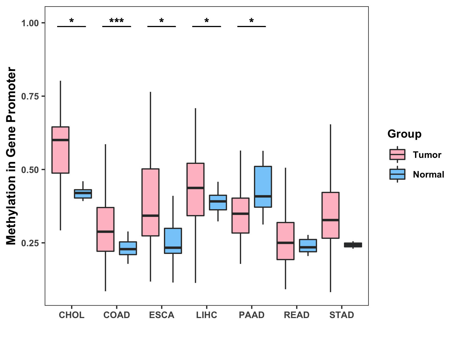 Boxplot of All Gastrointestinal Cancer ( * : 0.01-0.05 , ** : 0.005-0.01 , *** : 0.0001-0.005 , **** : < 0.0001 ) |