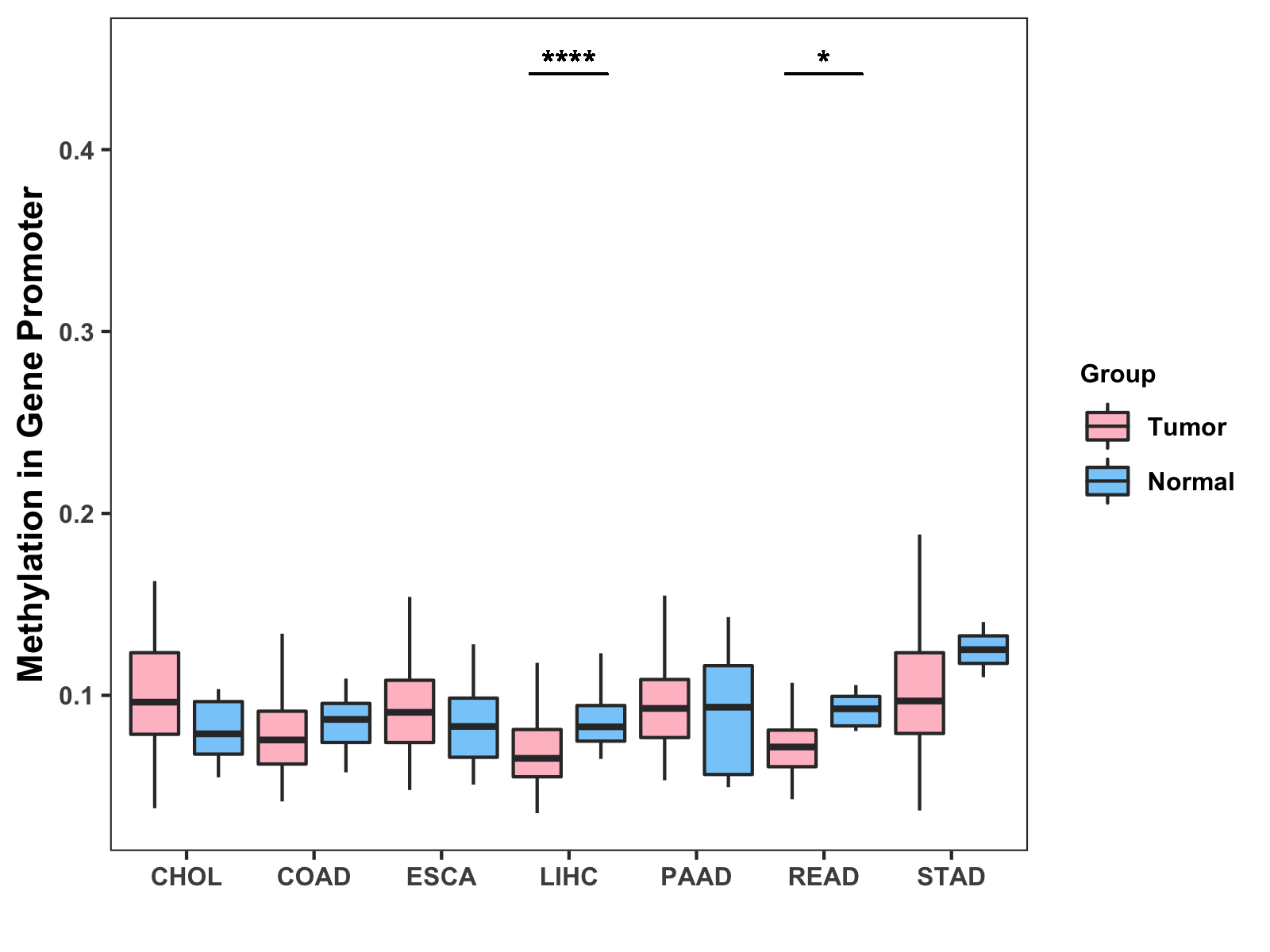 Boxplot of All Gastrointestinal Cancer ( * : 0.01-0.05 , ** : 0.005-0.01 , *** : 0.0001-0.005 , **** : < 0.0001 ) |