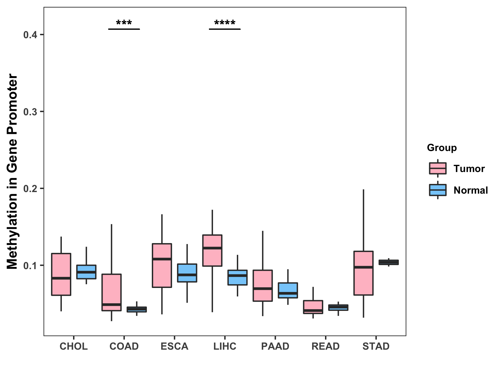 Boxplot of All Gastrointestinal Cancer ( * : 0.01-0.05 , ** : 0.005-0.01 , *** : 0.0001-0.005 , **** : < 0.0001 ) |
