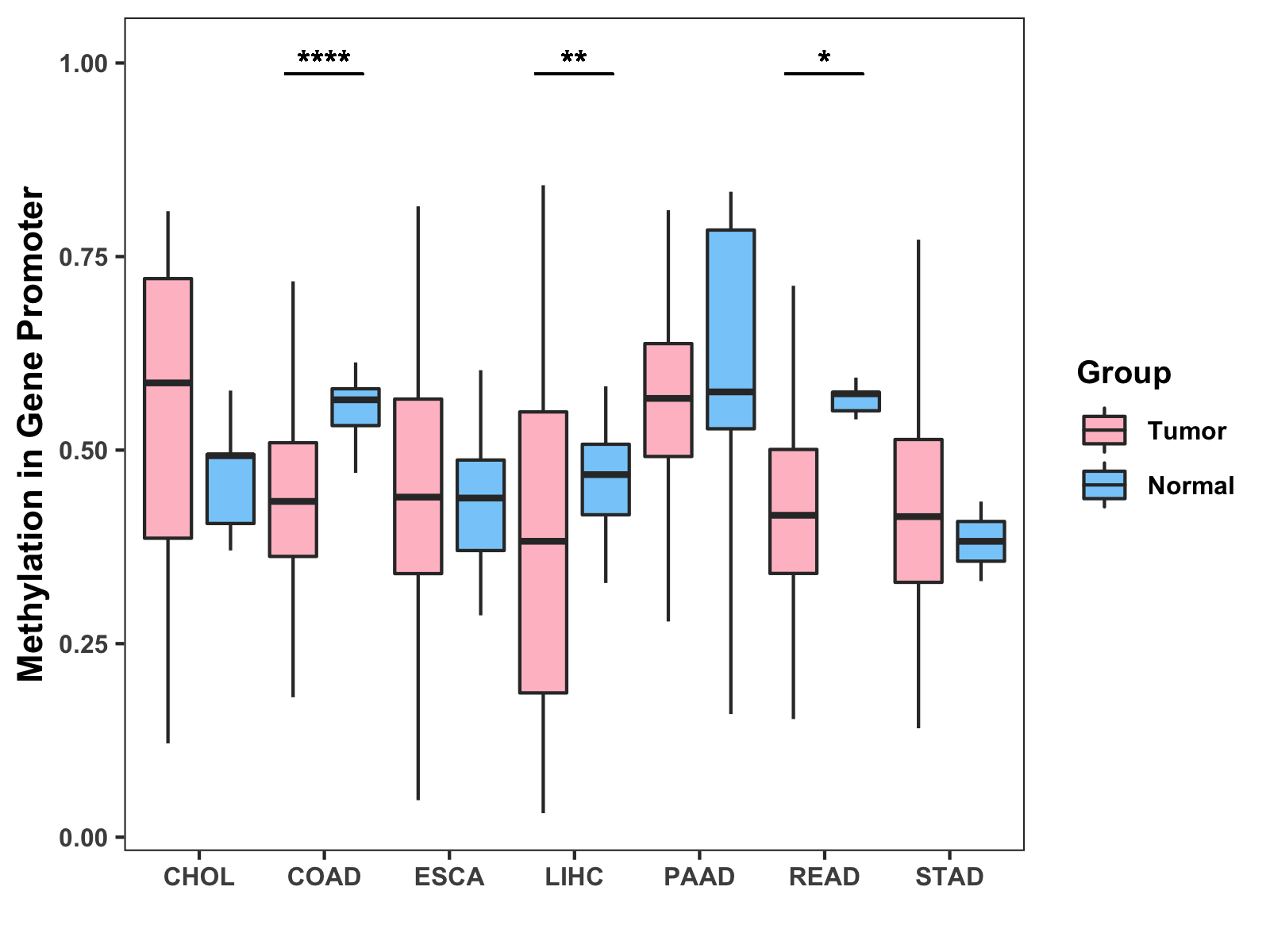 Boxplot of All Gastrointestinal Cancer ( * : 0.01-0.05 , ** : 0.005-0.01 , *** : 0.0001-0.005 , **** : < 0.0001 ) |