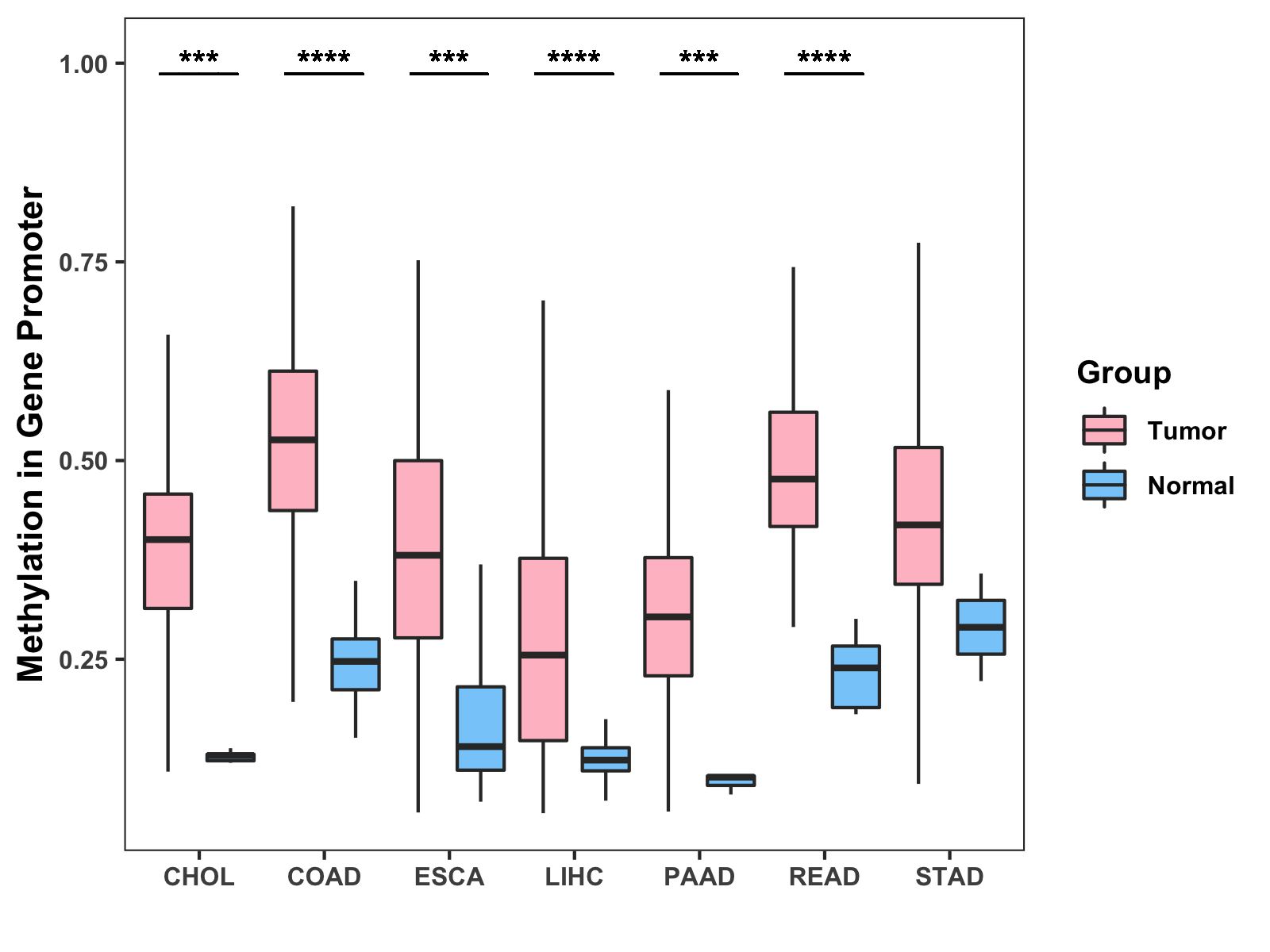 Boxplot of All Gastrointestinal Cancer ( * : 0.01-0.05 , ** : 0.005-0.01 , *** : 0.0001-0.005 , **** : < 0.0001 ) |