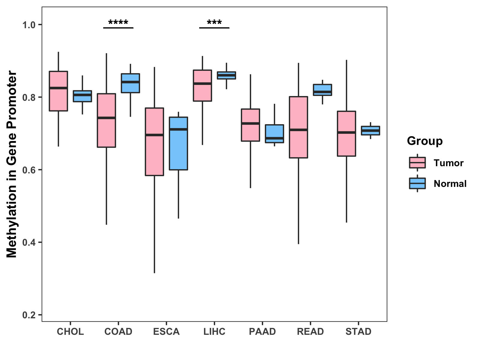 Boxplot of All Gastrointestinal Cancer ( * : 0.01-0.05 , ** : 0.005-0.01 , *** : 0.0001-0.005 , **** : < 0.0001 ) |