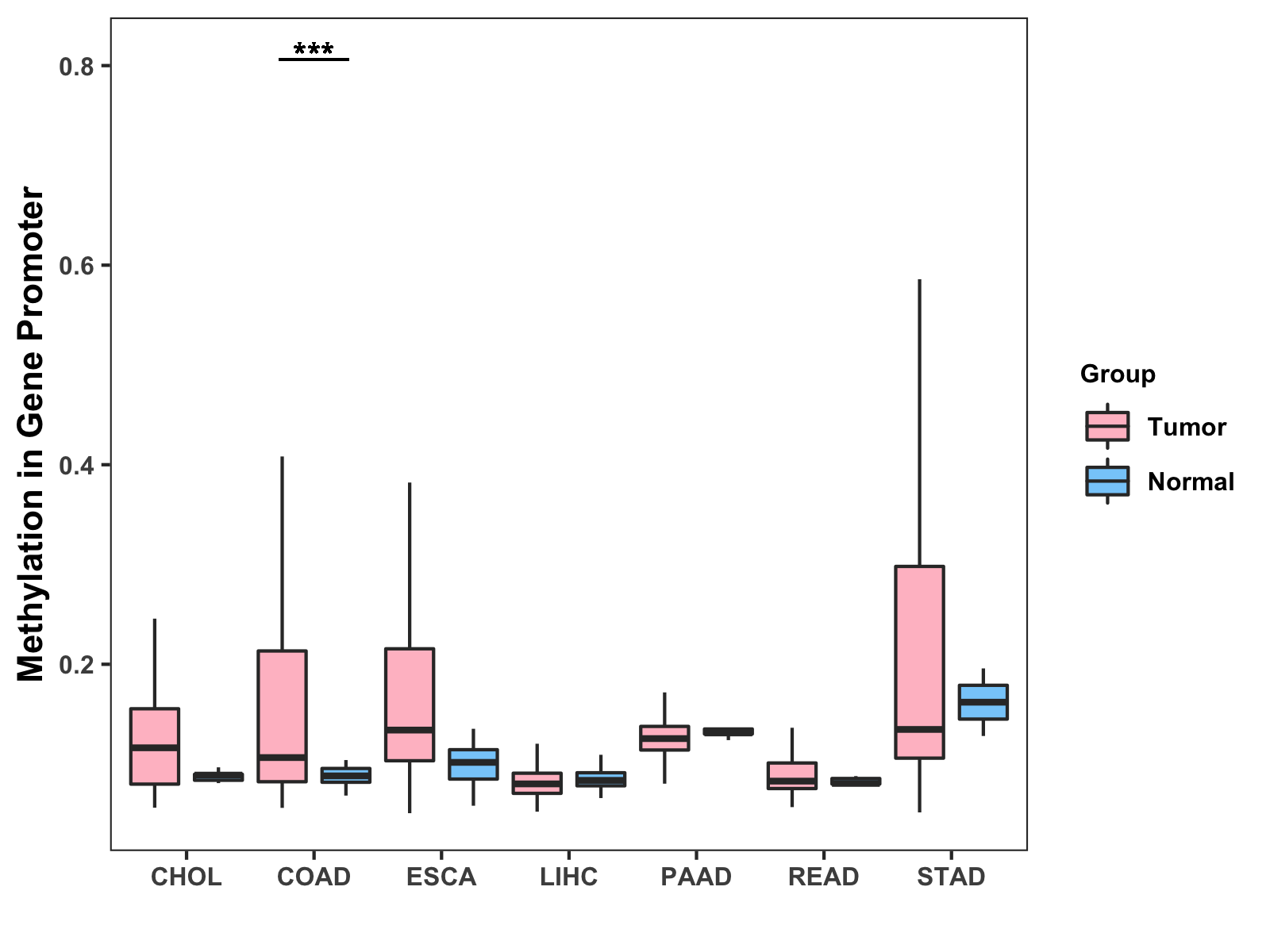 Boxplot of All Gastrointestinal Cancer ( * : 0.01-0.05 , ** : 0.005-0.01 , *** : 0.0001-0.005 , **** : < 0.0001 ) |