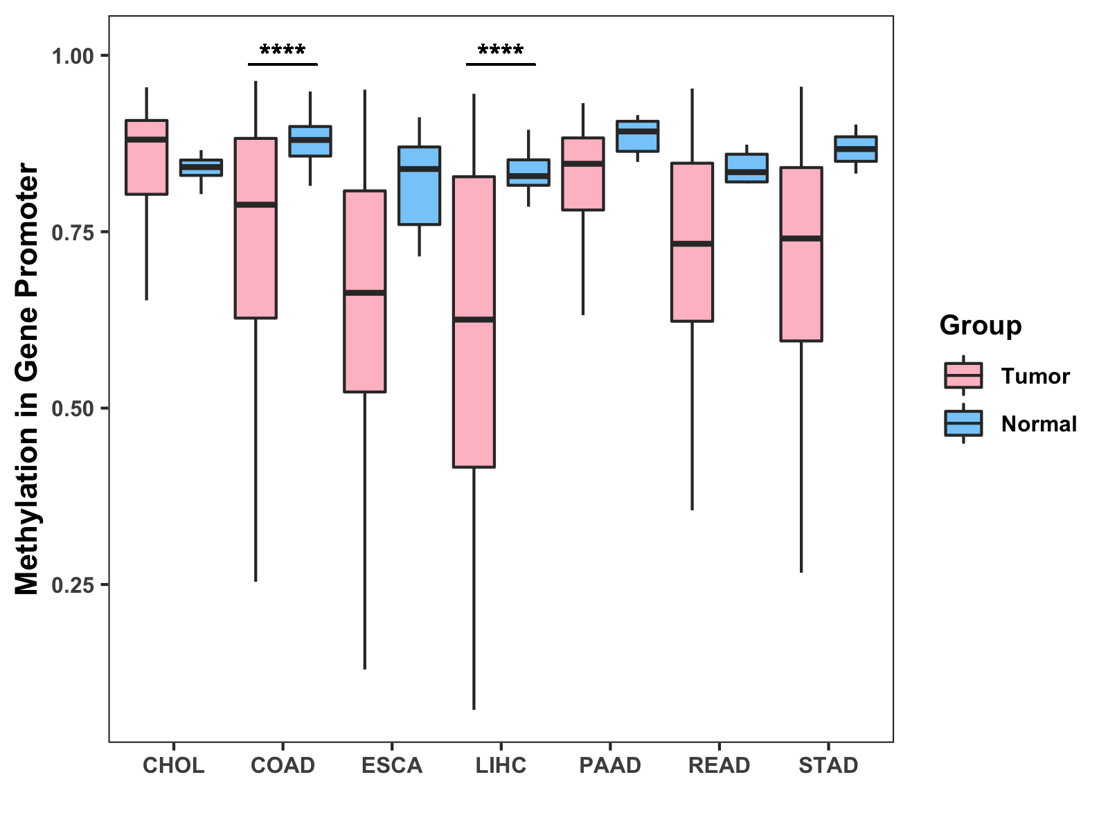 Boxplot of All Gastrointestinal Cancer ( * : 0.01-0.05 , ** : 0.005-0.01 , *** : 0.0001-0.005 , **** : < 0.0001 ) |