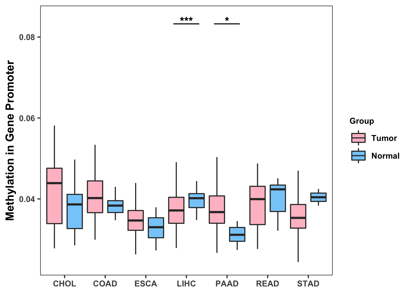 Boxplot of All Gastrointestinal Cancer ( * : 0.01-0.05 , ** : 0.005-0.01 , *** : 0.0001-0.005 , **** : < 0.0001 ) |