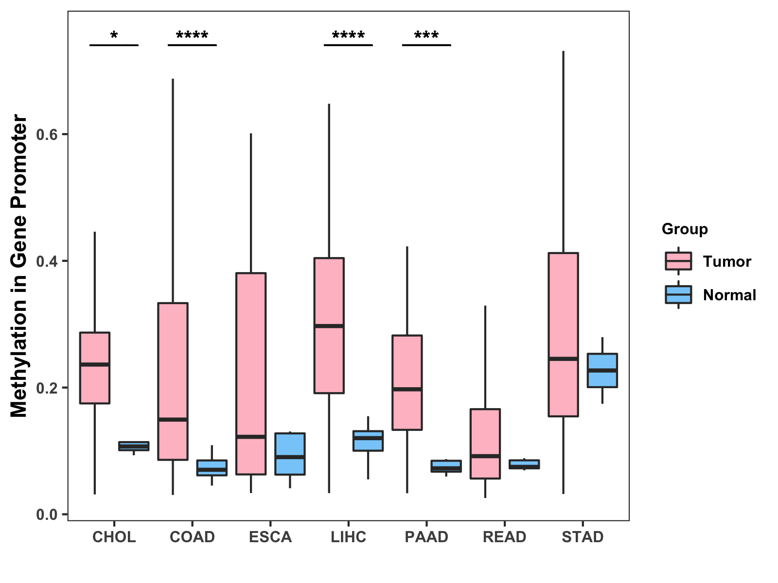Boxplot of All Gastrointestinal Cancer ( * : 0.01-0.05 , ** : 0.005-0.01 , *** : 0.0001-0.005 , **** : < 0.0001 ) |
