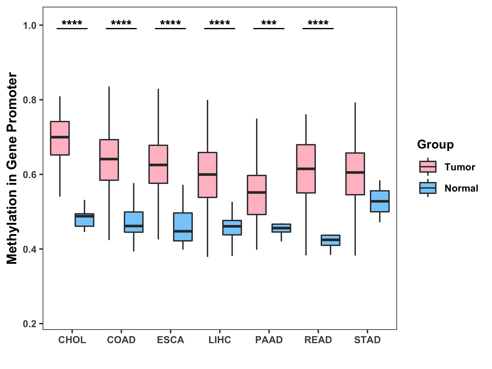 Boxplot of All Gastrointestinal Cancer ( * : 0.01-0.05 , ** : 0.005-0.01 , *** : 0.0001-0.005 , **** : < 0.0001 ) |