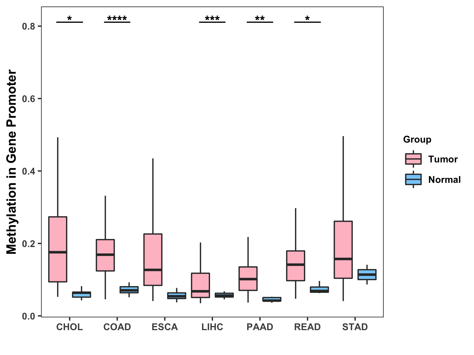 Boxplot of All Gastrointestinal Cancer ( * : 0.01-0.05 , ** : 0.005-0.01 , *** : 0.0001-0.005 , **** : < 0.0001 ) |