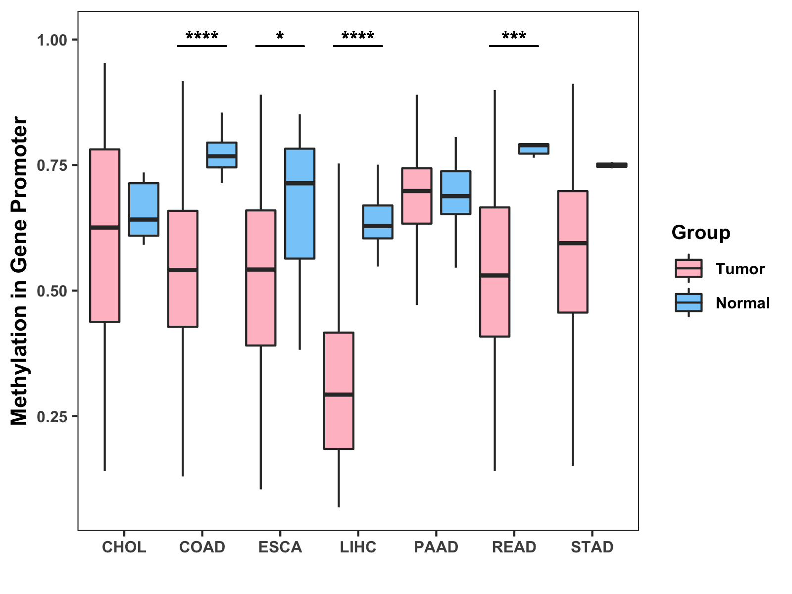 Boxplot of All Gastrointestinal Cancer ( * : 0.01-0.05 , ** : 0.005-0.01 , *** : 0.0001-0.005 , **** : < 0.0001 ) |
